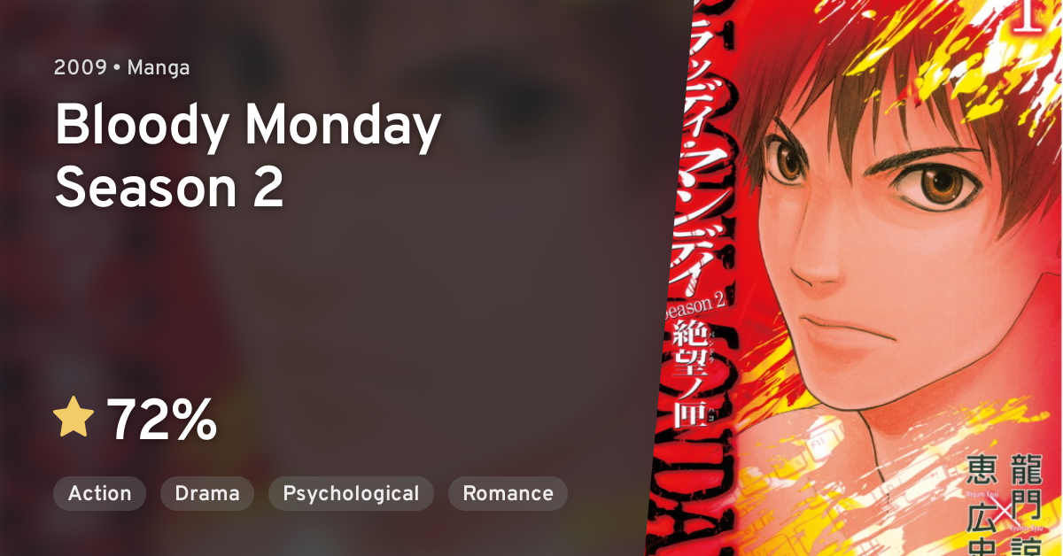 Bloody Monday Season 2, Vol 06 by Ryou Ryumon 412 · 43 Ratings · 1 Reviews · published 11 · 3 editions Two years after the end of Bloody Monday, a new thFind out more with MyAnimeList, the world's most active online anime and manga community and database Two years after the end of Bloody Monday, a new threat emerges intent on destroying Japan But what will happen now that "Falcon" has since disappeared?Bloody Monday Season 2 Zetsubou no Kou Chap 041 0913 0744 98 lượt xem;